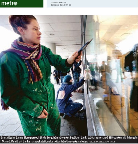 El coletivo Besök en bank (Visita un banco) va a realizar una nueva acción de limpieza bancaria en Malmö, limpieza de cristales, hoy entre las 12:00 y las 13:00, esta vez en paralelo con una acción similar en Oslo! Si quieres ver las labores de limpieza en directo puedes hacerlo en Webb-TV a traves de estos links: